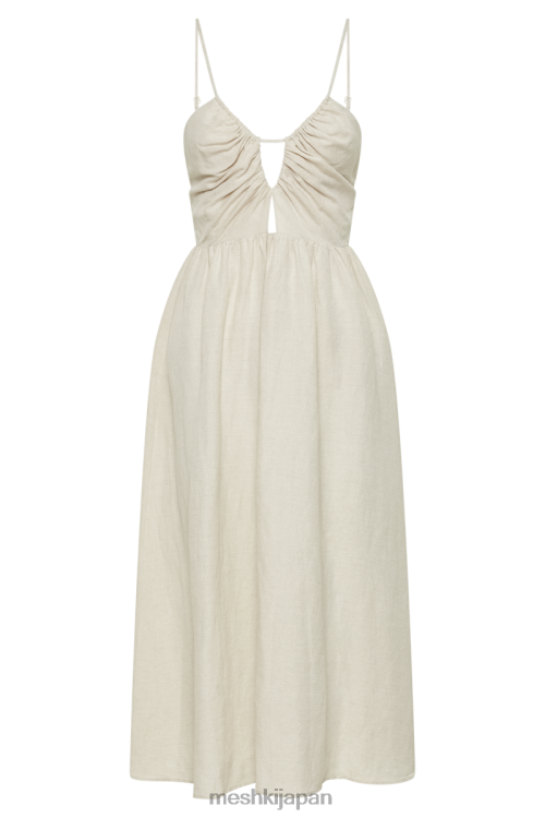これは、調節可能なショルダーストラップ、フレアスカート、シャーリング付きのスクープネックラインを備えたノースリーブのミディドレスです。ボディスの前面中央には、胸の中央とウエストの上部に小さなカットアウトがあります。ショルダーストラップは薄く調節可能な生地のストリップで、ネックラインとバストパネルに織り込まれており、ボディスがぴったりとカーブを描くような錯覚を生み出します。軽いリネン生地でフレアして縫製され、 ブランデーアンクルストラップヒールと組み合わせて外観を完成させます。